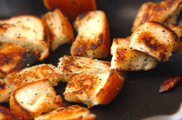 食パンは手でちぎってフライパンに入れ、サラダ油を染み込ませ、粗びき黒コショウを振る。強めの中火にかけ、薄いキツネ色になるまで炒め、火を止める。熱いうちに粉チーズをからめて冷ます。