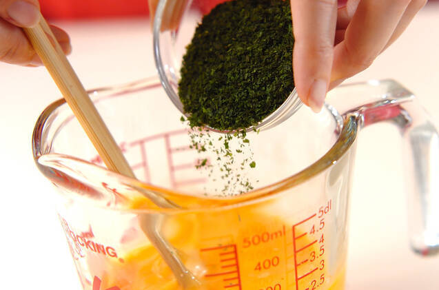 卵を割りほぐし、アオサ、<調味料>の材料を加えてよく混ぜ合わせる。