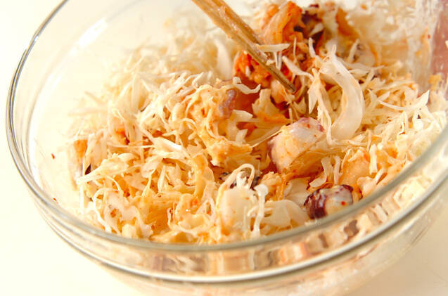 ボウルに卵を溶きほぐし、だし汁と小麦粉を加えてサックリと混ぜ、さらにゆでタコ足、白菜キムチ、キャベツ、天かすを入れて混ぜ合わせる。