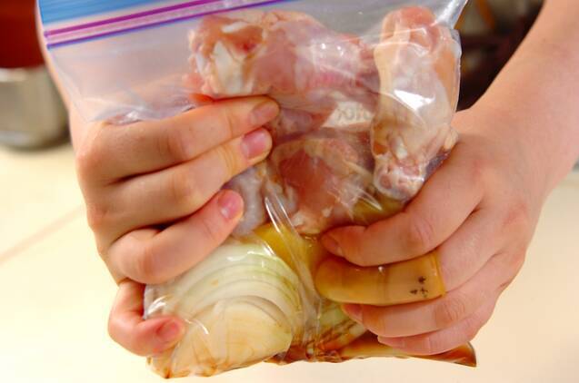 玉ネギは5mm幅の薄切りにする。パイナップルは半分に切る。密封できる袋に全ての材料を入れ、揉み込む。
