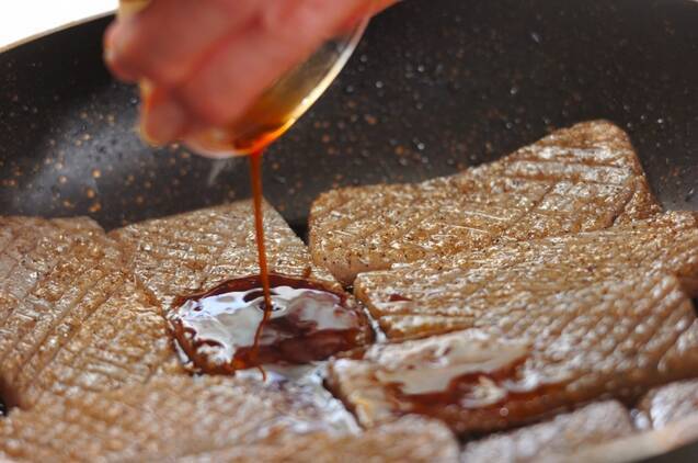 フライパンに板コンニャクを入れて炒める。両面に焼き目が付いたら<調味料>を加えて炒め合わせる。器に盛って(1)とネギをのせ、粗びき黒コショウを振る。
