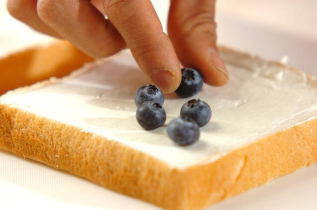 食パンにサワークリームをぬり、ブルーベリーを散らし、グラニュー糖、シナモンパウダーを振る。