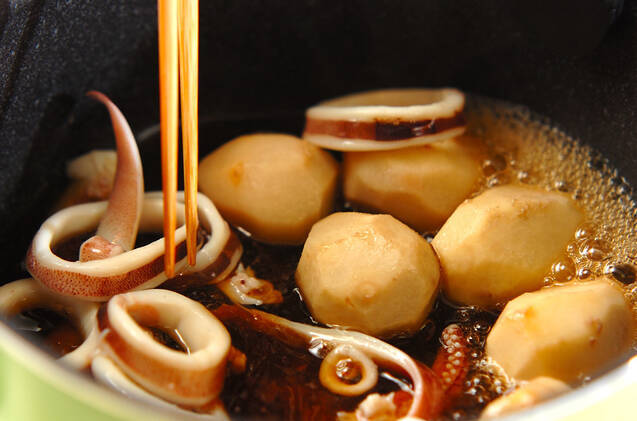 最後にイカを鍋に戻し入れ、イカにだし汁をからめるように1分位煮、サヤインゲンを加えて火を止める。器に盛り合わせ、煮汁を全体にかける。
