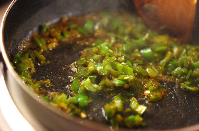 フライパンにサラダ油を中火で熱し、(1)の万願寺唐辛子を炒める。火が通ったら<調味料>を加えて汁気がなくなるまで炒め合わせる。火を止めて七味唐辛子を振る。