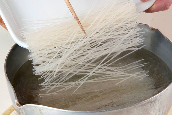 ビーフンはほぐし、熱湯に3~4分つけて柔らかく戻す。水洗いして水切りし、食べやすい長さに切る。