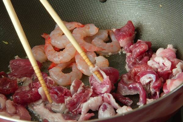 中華鍋にサラダ油大3、ニンニクを入れて中火にかけ、香りが立ってくれば、豚バラ肉、エビを加えて炒めあわせる。