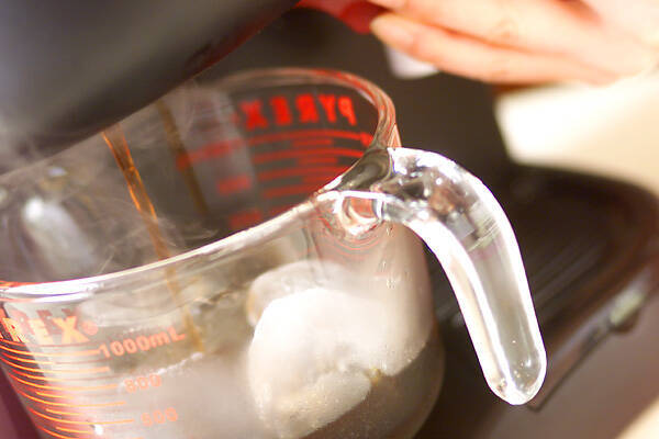 <イタリアンコーヒー>を説明書にそって入れる。氷を入れた耐熱ボウルに一気に注ぎ、コーヒーが冷えるまで撹拌し、冷えれば氷を取り除き、冷蔵庫で冷やす。