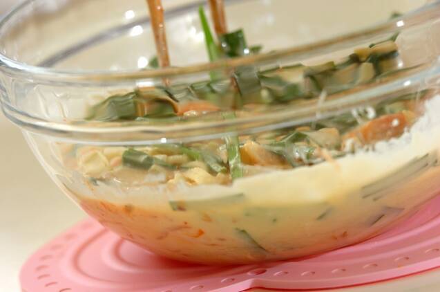 (1)にニラ、白菜キムチ、ピザ用チーズを加えてサッと混ぜる。