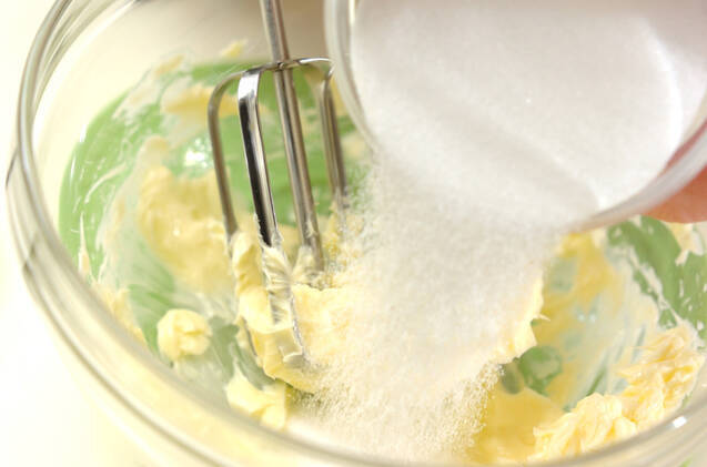 ボウルに無塩バターを入れてハンドミキサーで混ぜ、微粒グラニュー糖を加えて白っぽくなるまですり混ぜる。