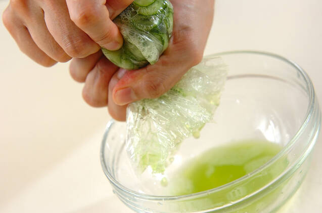 ビニール袋の空気をしっかり抜いて、口を縛る。水気が出てきたら、塩が付いたまま水気を絞る。