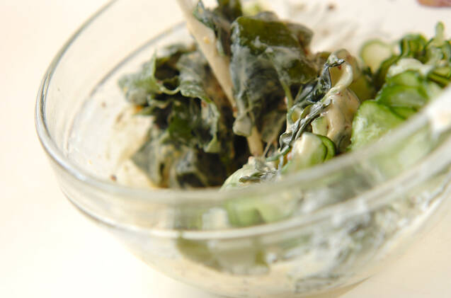 <ドレッシング>のボウルにワカメ、キュウリを加えて和え、器に盛る。