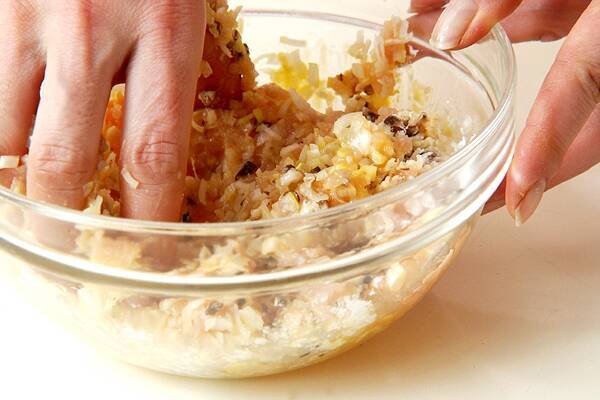 ボウルに鶏ひき肉、干しシイタケ、卵、酒、白ネギ、ショウガ、片栗粉を加えてよく混ぜ合わせ、8~10等分に分ける。