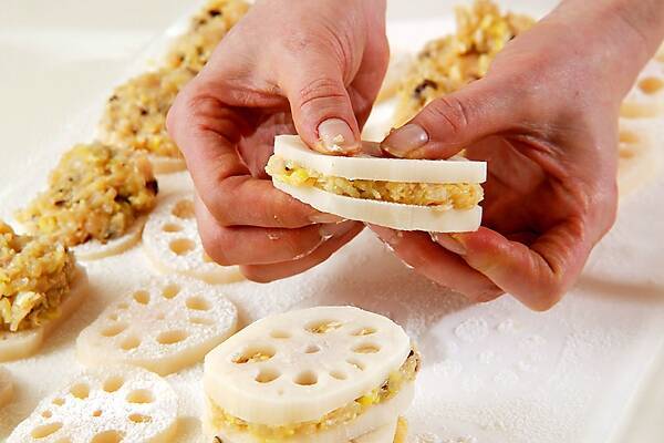 レンコンの水気を拭き取り、片面に薄く小麦粉をつけ、1をはさむ。