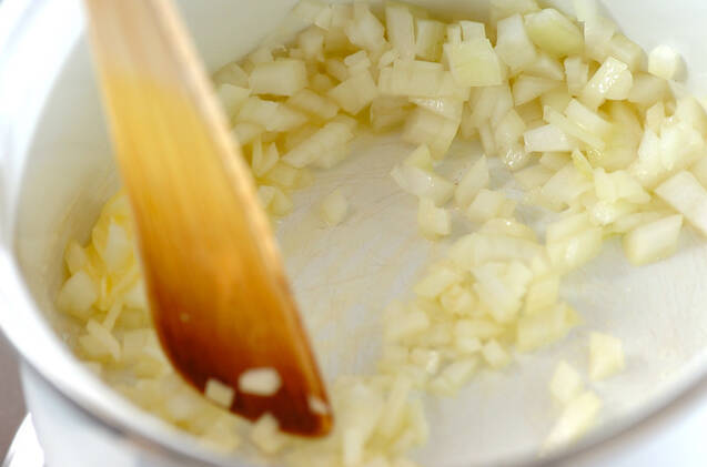 鍋にバターを溶かして玉ネギを炒め、しんなりしたら<スープ>の材料を加え煮たたせる。