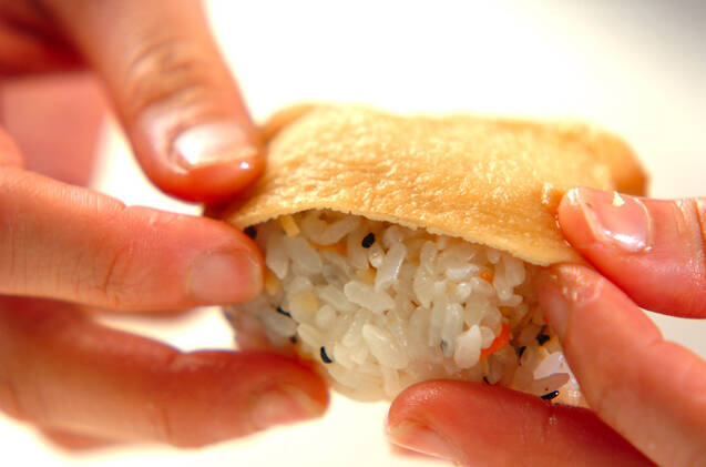 冷めたら、(2)、香ばしく炒った黒ゴマを混ぜ合わせ、10~12等分に分けて軽く俵状に握っておく。軽く汁気をきった油揚げで包み、形を整えて器に盛り付け、甘酢ショウガを添える。