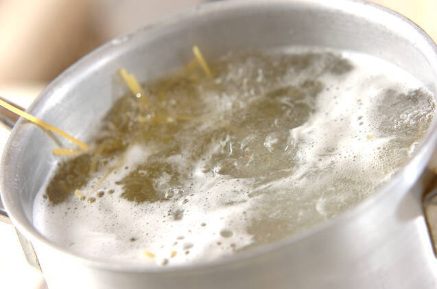 たっぷりの熱湯を沸かし、ゆでる用の塩を加える。パスタを袋記載の指示より1分短かめにゆで始める。