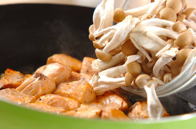 その間にフライパンにオリーブ油、ニンニクを入れ、弱めの中火にかけ、香りが立ったら鮭を加え炒める。シメジを加え、塩コショウをして、しんなりするまで炒め合わせる。