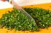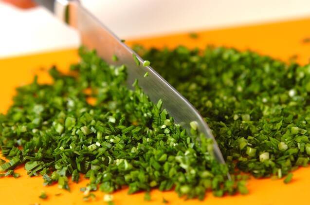 ニラはかたい部分を切り落とし、みじん切りにする。さらに包丁で粘りがでるまで叩く。ニラを容器に入れてしょうゆを注ぎ、軽く混ぜ合わせる。