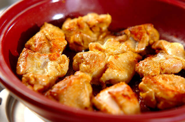 タジン鍋にオリーブ油を入れ、鶏もも肉を軽く焼き色がつくまで焼く。