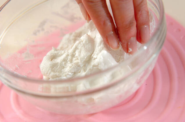 ボウルに白玉粉を入れ、耳たぶ位のかたさになるまで少しずつ水を加えながら混ぜ、ひとまとめにする。