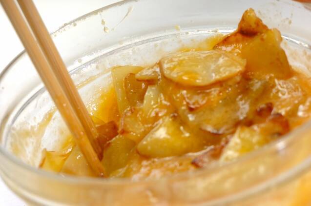 小さめのフライパンにサラダ油大さじ1を中火で熱し、ジャガイモを焼き色がつくまで焼き、<卵液>のボウルに加えて混ぜ合わせる。