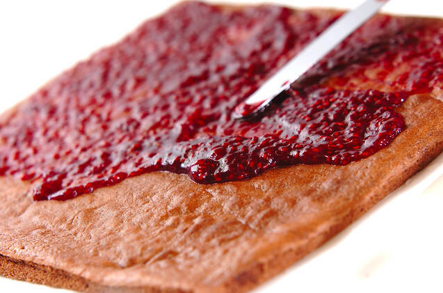<ビスキュイ生地>の上に<シロップ>をたっぷりぬる。温めたフランボワーズジャムをたっぷりぬり広げる。