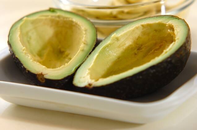 アボカドは種に沿って縦に1周切り込みを入れ、両手でひねるように半分に分けて種を取り除く。実は皮から1cmほど残してくりぬく。プチトマトは横半分に切る。