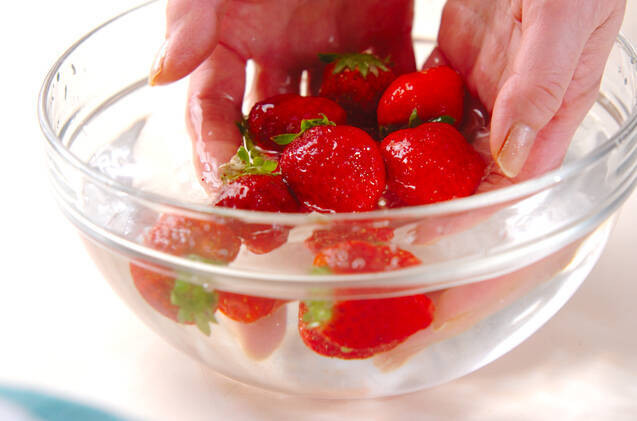 イチゴは塩少々を入れた水でやさしく洗い、ヘタを切り落とし、縦1/2又は1/4に切る。