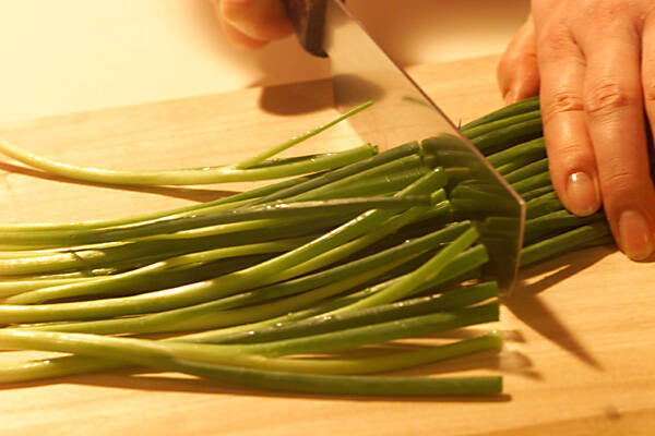 万能ネギはきれいに水洗いし、水気をきって、フライパンに入る長さに切る。玉ネギは縦薄切りに、ニラは根元を少し切り落とし、3cmの長さに切る。赤ピーマンは縦半分に切り、種とワタをとり縦細切りにする。