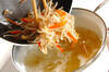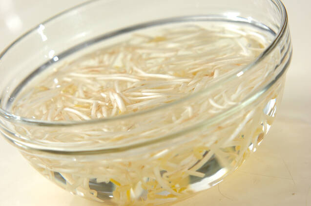 モヤシはできれば根を取り除き、たっぷりの水に放ってシャキッとさせ、ザルに上げてしっかり水気をきってザク切りにする。ニンジンは皮をむいて細切りにする。鶏ささ身は筋を引き、細切りにする。