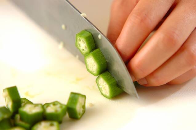 オクラはまな板に並べて塩をかけ、手のひらでこすりながら繊毛を取り、水洗いして水気をきる。ヘタを切り落とし、厚さ5mmの輪切りにする。