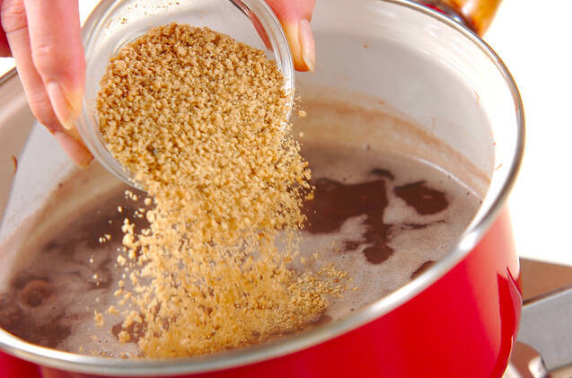 鍋にゆで小豆缶、同量の水を加えてひと煮立ちさせ、すり白ゴマを混ぜ合わせる。