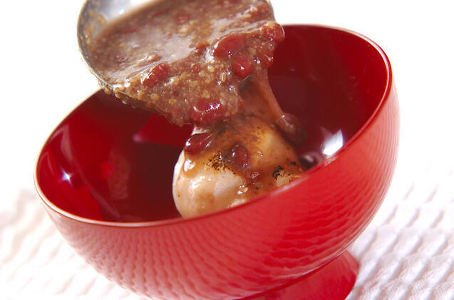 器に焼きお餅を入れ、2のゆで小豆を注ぎ入れ、栗の甘露煮を加える。塩ふき昆布、しば漬けを添える。