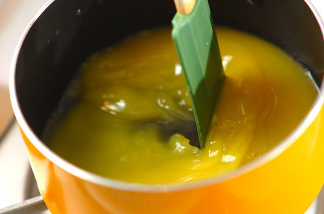 鍋にオレンジジュースと砂糖を入れて火にかけ、砂糖が溶けたら火を止め、ゼラチンを加えて余熱で溶かす。