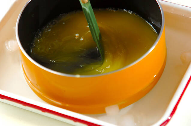 鍋底を氷水にあてながら混ぜ、トロミがついてきたら器に移し入れ、冷蔵庫で冷やしかためる。