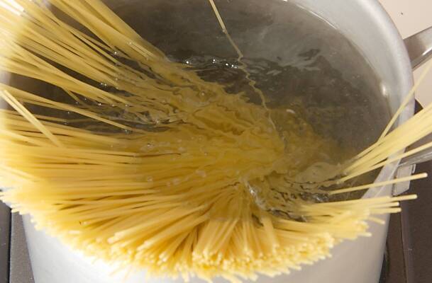 たっぷりの熱湯に塩を加え、スパゲティをバラバラと入れ、くっつかないように、時々菜ばしで混ぜる。指定時間より少し短めにゆでてザルに上げる。