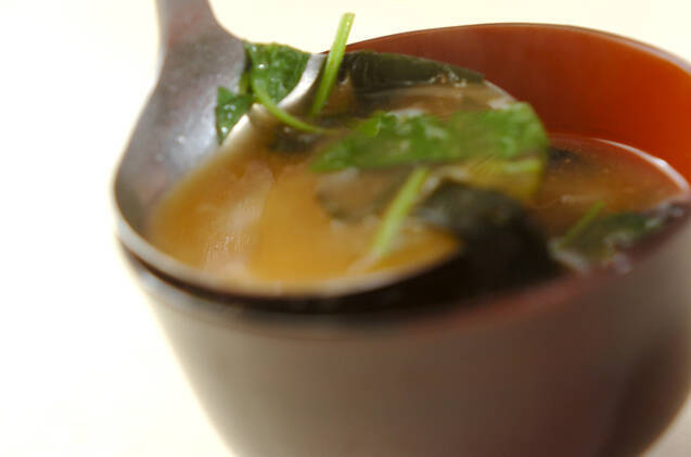 煮たつ直前で火を止め、ワカメ、ミツバを加えて器に注ぐ。