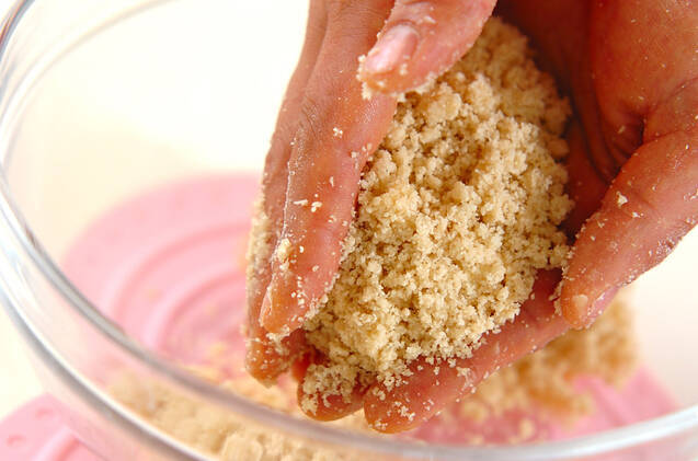 <クラム>を作る。バターは小豆粒位の大きさに切って冷凍庫に入れておく。バター以外の材料をボウルに入れて混ぜ合わせ、バターを加える。粉をからませながら指先でバターをつぶしながら混ぜ合わせる。全体に混ざったら手の平をこすり合わせ、ポロポロ状になれば冷蔵庫に入れておく。