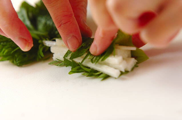 大葉に<合わせ梅肉>をつけて長芋を巻き、器に盛ってしょうゆを添える。