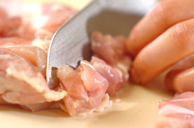 鶏もも肉は削ぎ切りにして<下味>の材料をからめる。