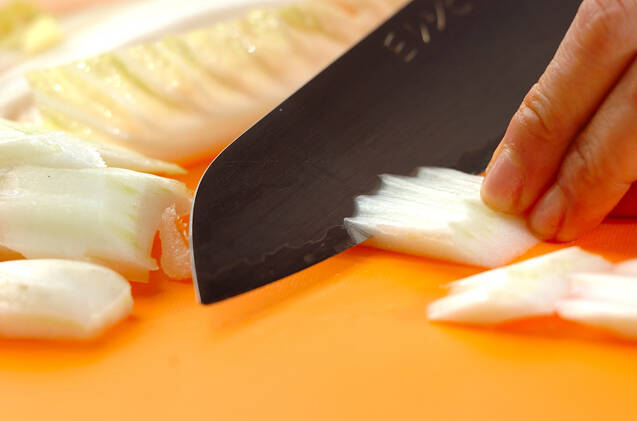 白菜は、軸は食べやすい大きさの削ぎ切りに、葉はザク切りにする。