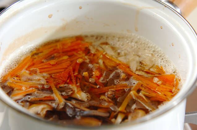 鍋にだし汁、<調味料>の材料を入れ、サヤインゲン以外の具を加えて火にかける。煮たったら火を弱めて2~3分煮てザルに上げ、具と煮汁に分ける。
