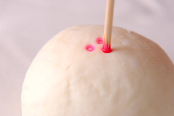 ごまあんまんは、生地の中央に4の種をのせ、丸く包んで水少々で溶いた食紅を竹串の尖ってない方につけて上面を飾る。ひとまわり大きく切ったクッキングシートに1個ずつ並べる。