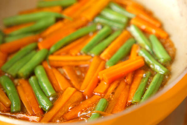煮立てば<調味料>を加え、煮汁が少なくなるまで煮る。