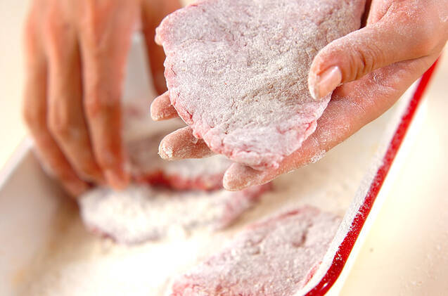 牛もも肉に<衣>の小麦粉を薄く絡め、余分な粉を払い落とす。残りの小麦粉、卵、牛乳を混ぜ合わせる。