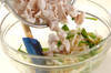 モヤシをゆでた熱湯に豚肉を加え、色が変わったらザルに上げ、(1)のボウルに加えて混ぜ合わせ、器に盛る。