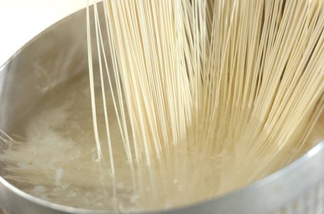 オクラは分量外の塩で表面をこすり、水洗いして水気を拭き取り、輪切りにする。ブラックオリーブは2~3つの輪切りにする。素麺はたっぷりのお湯でゆで、水洗いする。