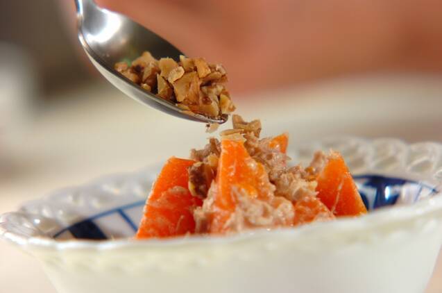 (1)にツナ、マヨネーズを加えて混ぜ合わせ、器に盛り、クルミを散らす。