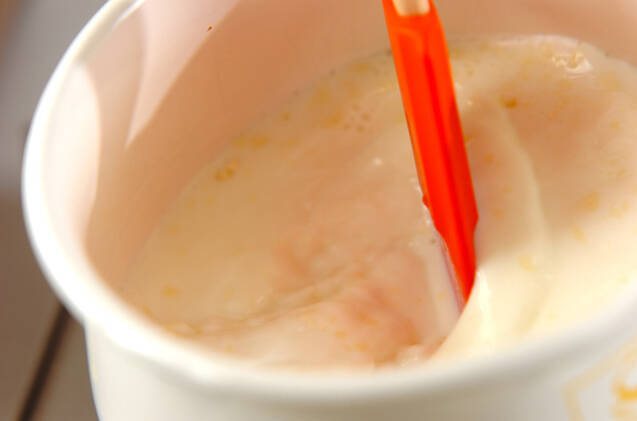 鍋に牛乳400ml、砂糖、ホワイトチョコレートを入れて火にかけ、煮溶かす。