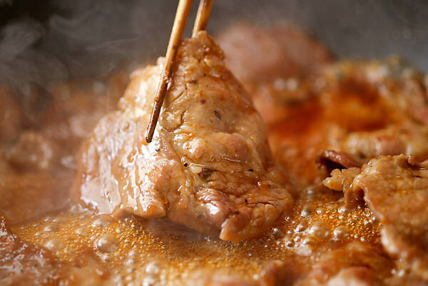 <合わせダレ>を一気に加え、全体にからめるように焼きつける。
